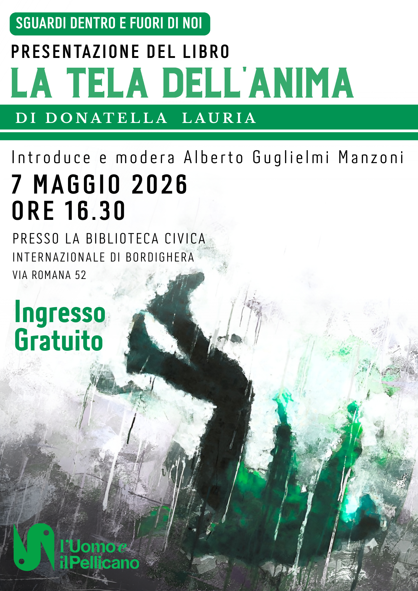 Giovedì 7 maggio 2026, alle ore 16:30, presso la Biblioteca Civica Internazionale di Bordighera, si terrà un nuovo appuntamento della rassegna culturale “Sguardi dentro e fuori di noi”. Protagonista del pomeriggio sarà la giornalista e scrittrice Donatella Lauria, che presenterà il suo romanzo “La tela dell’anima”. L’incontro, organizzato dalla Fondazione “L’Uomo e il Pellicano”, sarà condotto da Alberto Guglielmi Manzoni, che dialogherà con l’autrice per approfondire i temi centrali dell’opera.