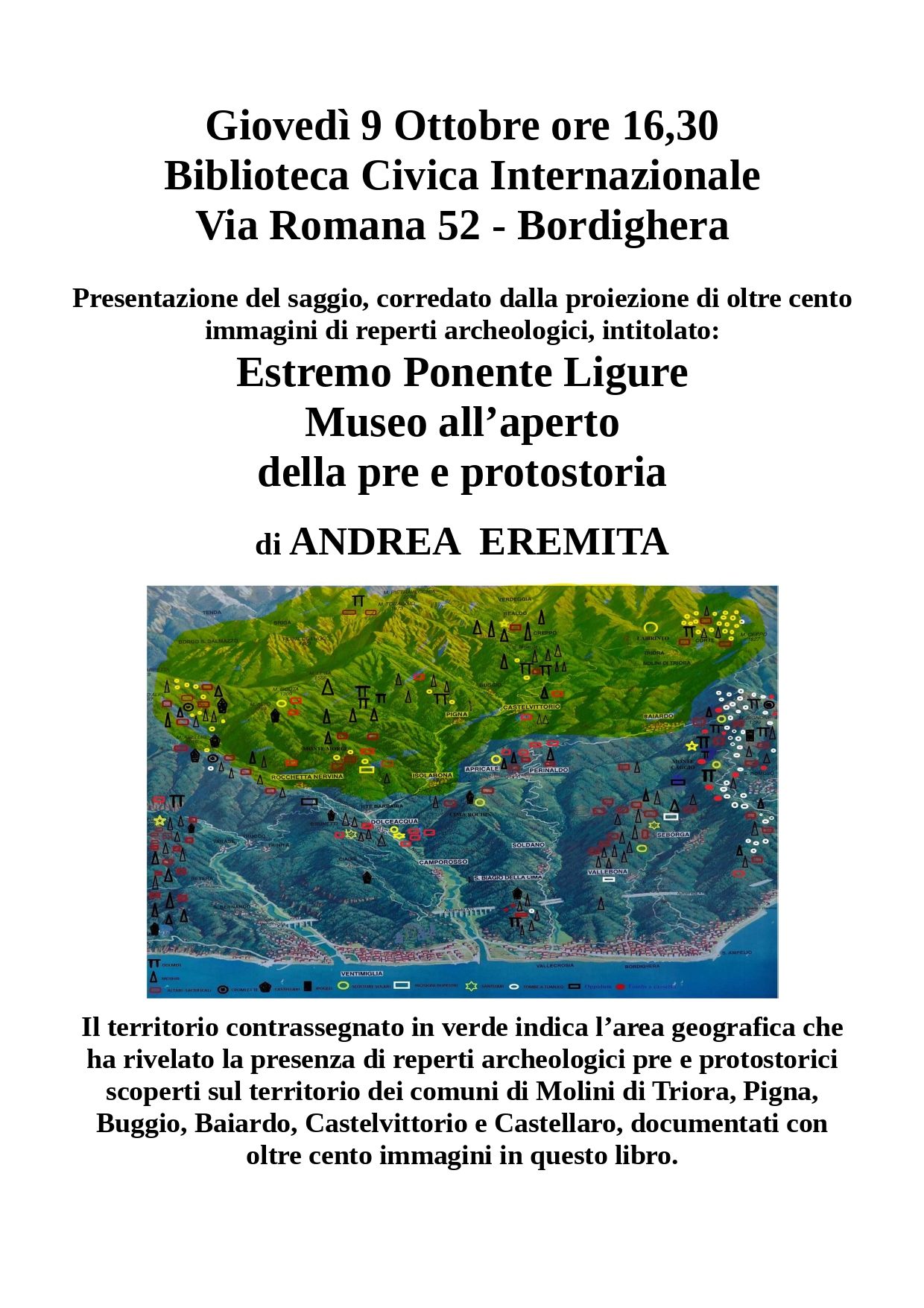 Nuovo appuntamento con l’autore alla Biblioteca Civica Internazionale di Bordighera: giovedì 9 ottobre 2025, alle 16.30, Andrea Eremita presenterà al pubblico il saggio “Estremo Ponente Ligure. Museo all’aperto della pre e protostoria”, impreziosito da un ricco repertorio di immagini.
